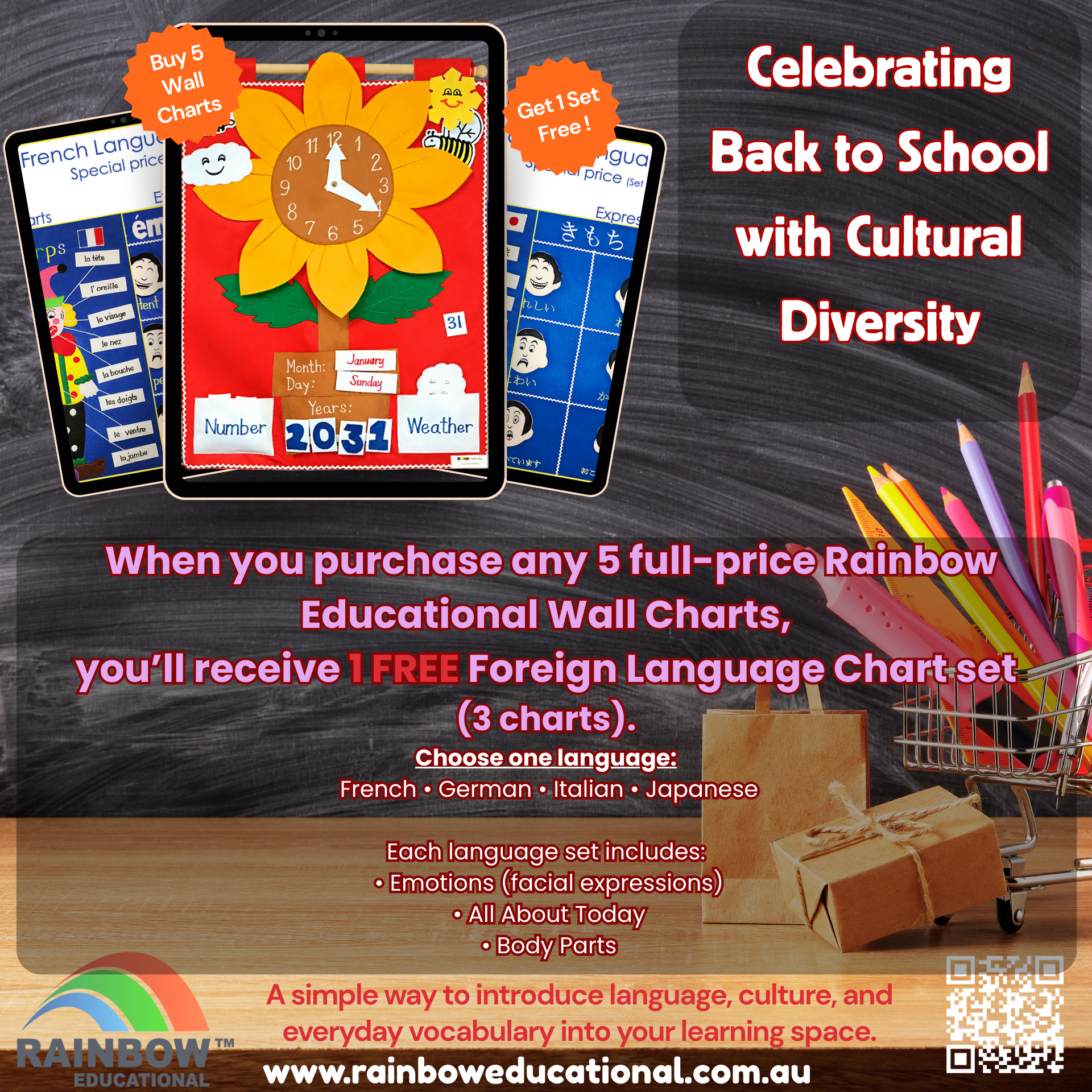 Choose any 5 wall charts and select your preferred Foreign Language Chart set as a Free Gift to you from the Rainbow Educational Family.